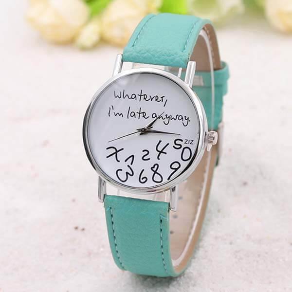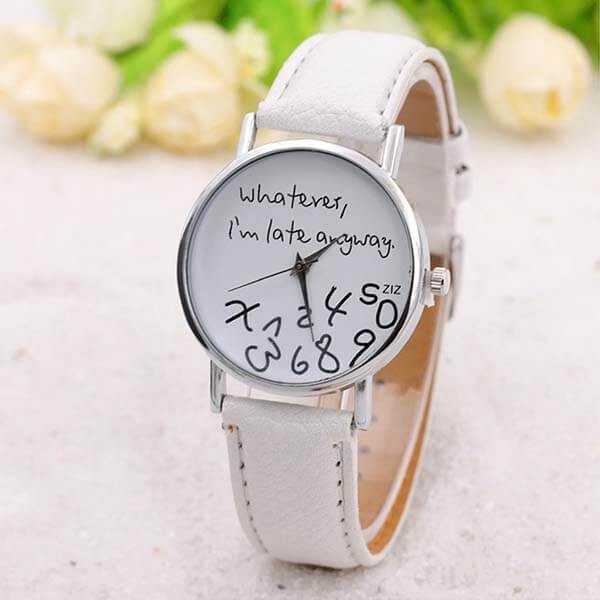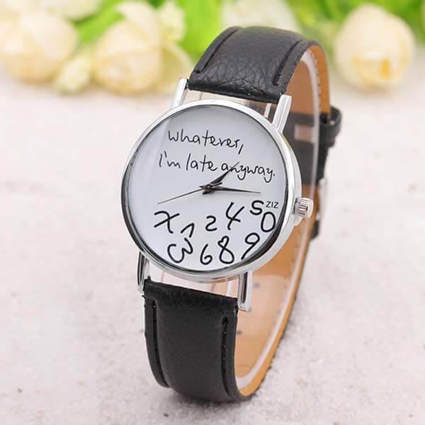 • Estampa "Que seja, eu estou atrasada mesmo." no relógio: único e diferente
